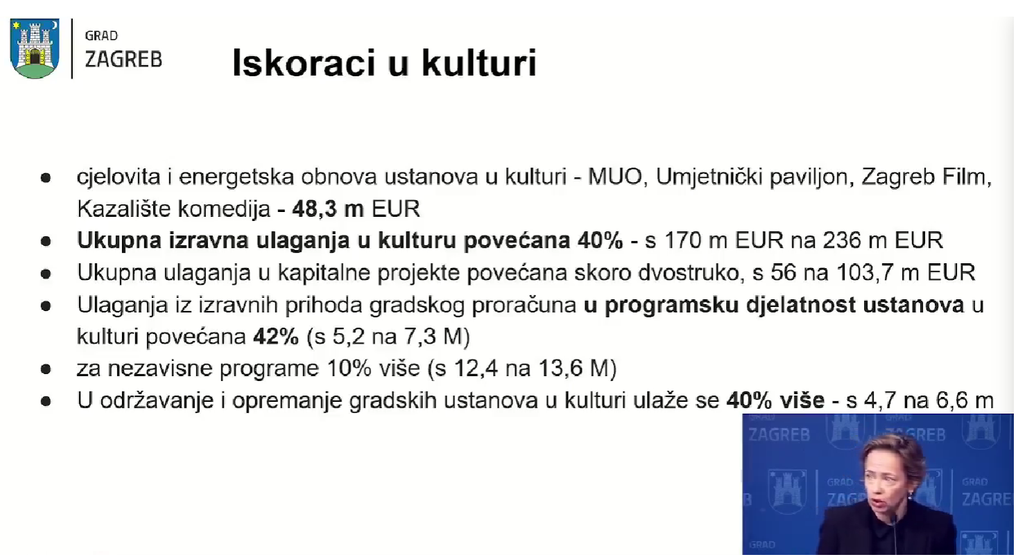 Dolenec je najavila nova ulaganja u kulturu, u pripremi je povećanje sredstava za čak 40%, sa 170 na ukupno 236 milijuna eura. Obnovit će se i Zagreb Film, Kazalište komedija, ali i Umjetnički paviljon te MUO.