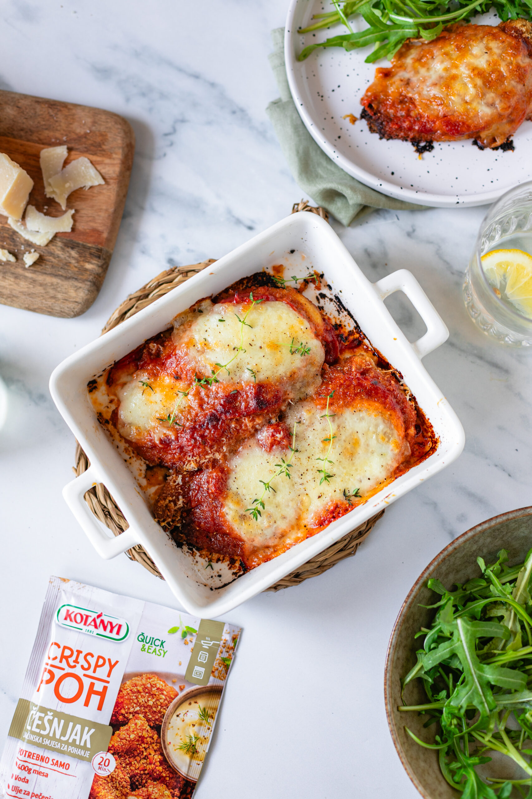 - Prženu piletinu složite u posudu za pečenje. Na svaki komad stavite 1–2 žlice umaka, nekoliko ploški mozzarelle i pospite parmezanom. Zapecite u pećnici 10 minuta dok se sir ne otopi i lagano ne porumeni.