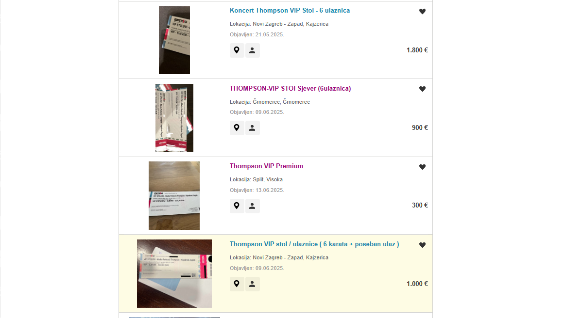 Na kraju se ispostavilo da uopće nije tako. Otišli smo primjerice provjeriti stanje na daleko najpopularnijoj hrvatskoj platformi za prodaju. Izlistana su čak 1600 i više oglasa kada upišete ključne riječi “Thompson Zagreb”. Prevedeno, samo ovdje je u ponudi nekoliko tisuća ulaznica za koncert jer je većina oglasa popunjena s nekoliko ulaznica.