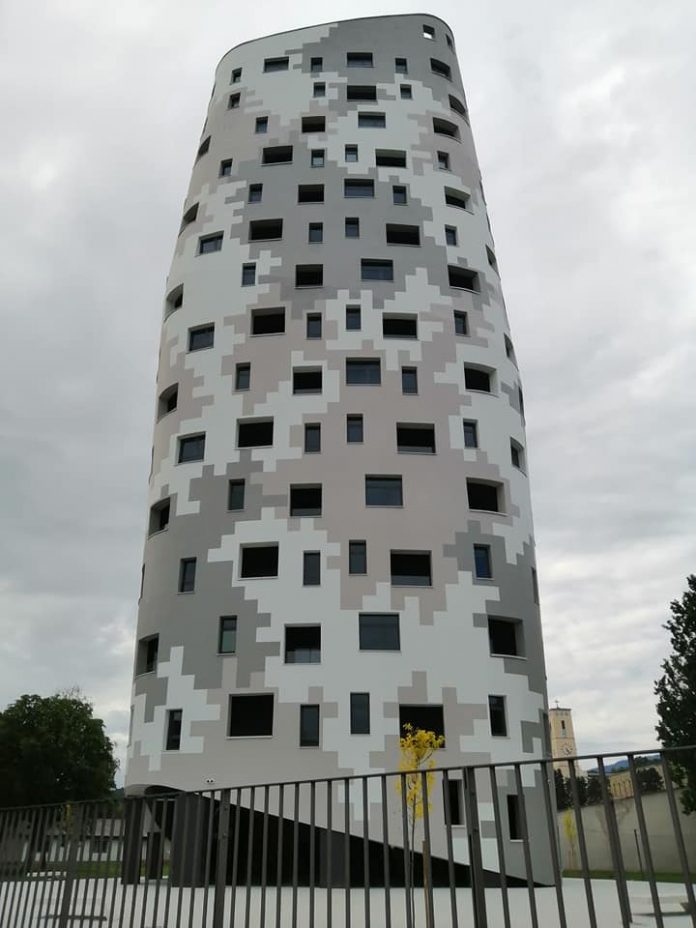 “Posebnosti ima puno, ali one najznačajnije su definitivno ventilirana, monolitna fasada s izboranim plaštom, otvorima prozora i loggia, te njen završni izgled – vrlo komplicirana izvedba bojanja stiliziranog, pikseliziranog maskirnog uzorka na višesmjerno zakrivljenoj površini”.