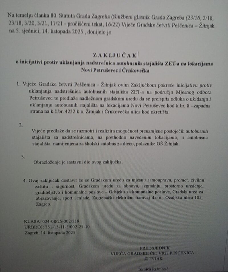 “U međuvremenu su i Vijeće Mjesnog odbora Petruševec i Vijeće Gradske četvrti Peščenica – Žitnjak donijeli jednoglasne odluke kojima jasno traže da nadstrešnice ostanu na postojećim lokacijama, jer su prijeko potrebne djeci koja koriste školsku autobusnu liniju. Osnovna škola Žitnjak službeno je potvrdila da im je korištenje tih nadstrešnica iznimno važno zbog sigurnosti učenika”, potvrdio je Rašić i poslao nam zaključke sa sjednica.