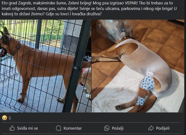 “Mog psa izgrizao VEPAR! Tko bi trebao za to imati odgovornost, danas pas, sutra dijete! Svinje se šeću ulicama, parkovima i nikog nije briga! U kakvoj to državi živimo? Gdje su lovci i lovačka društva?”, pitala se. Mi smo istražili tko je odgovoran za odstrel i bitnije, kako se možemo zaštiti od najezde ovih očito hrabrih sustanara,