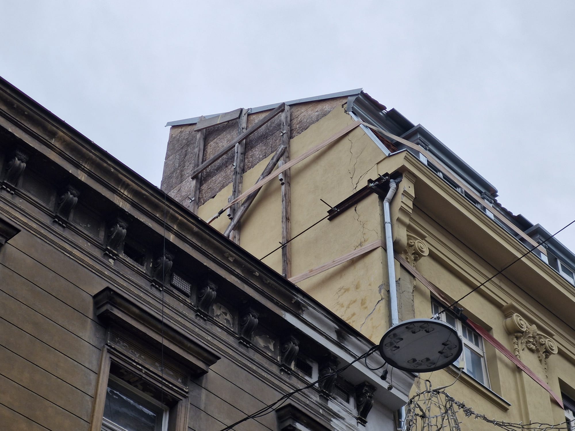 Čim smo zakoračili iz redakcije, krenuli smo put glavnog zagrebačkog trga i zaustavili se već na križanju Draškovićeve i Jurišićeve. Zgrada na uglu je u poprilično lošem stanju. Tik do krova, na posljednjem katu, odvalio se dio zida pa tako sada vidimo poprilično olabavljene cigle ali i instalacije koje se nalaze unutar zgrade. Svakako bi trebalo biti na oprezu, zaštite u obliku nekih jačih nadstrešnica iznad prizemlja – nema.