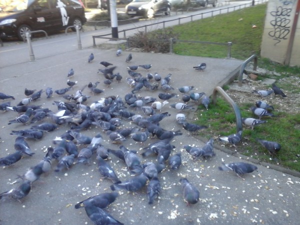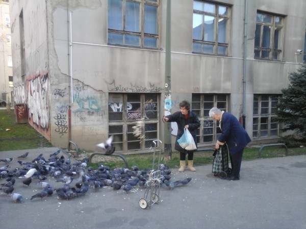 Dok mnogi gledaju svoja posla i bore se sa svakodnevnim brigama, ove dvije dame već tri godine zastanu i hrane golubove ispred srednje škole Nikola Tesla i X. gimnazije. U torbi na kotačiće donesu hranu, a golubovi poput pravih vjernih ljubimaca već predosjete da će njihov objed doći. Začuje se klepet krila dok još ni jedna mrvica nije izvađena iz vrećice.
