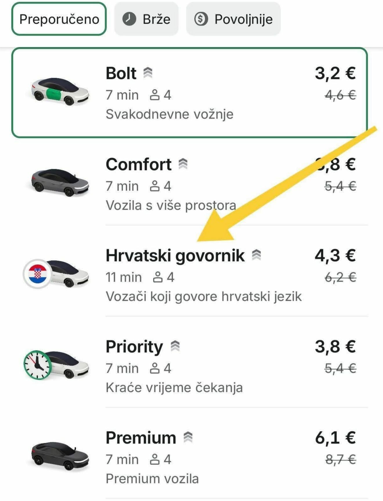 Dok ne dođe zakon, poslodavci koji se oslanjaju na strane radnike imaju novost. Odlučili su dodatno nagraditi one koji znaju hrvatski, a usput sebi dodati opciju putem koje će naposlijetku i više zaraditi. Popularni Bolt po novome nudi još jednu opciju prilikom narudžbe vozila. Od sada uz standardnu uslugu i onu malo luksuzniju (automobil bolje klase), vožnju s ljubimcem i slično, možete naručiti vozača koji govori hrvatski.