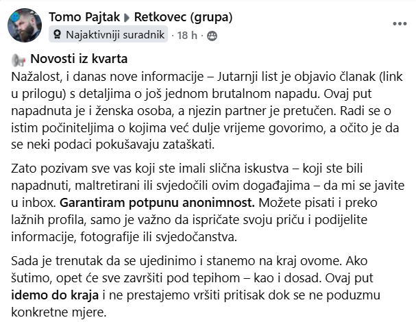 “Ja danas planiram napraviti objavu gdje ću pozvati sve da šalju mail na ured pravobraniteljice Helene Pirnat Dragičević s istom porukom koju još smisliti, ali nešto u stilu da kako se može pustiti da delinkvent s 30 prijava da slobodno hoda po vani, zašto se zataškavaju slučajevi napada, jer meni se hrpa ljudi javila sa svjedočanstvima o tome, a nitko ništa ne zna, pa eto da nju bombardiramo i njen mail s tim upitima, pa možda se netko osvijesti”, poručio je.