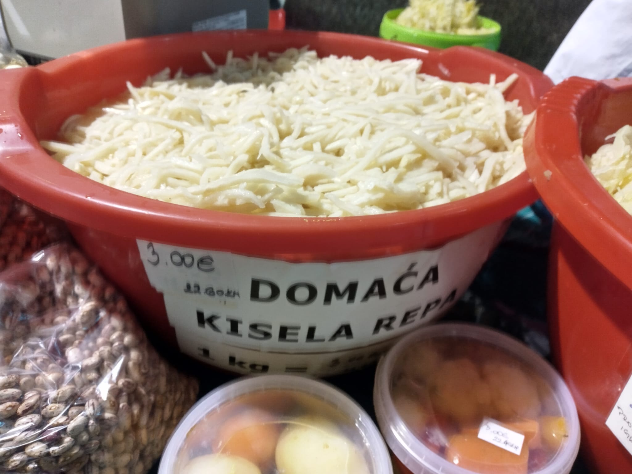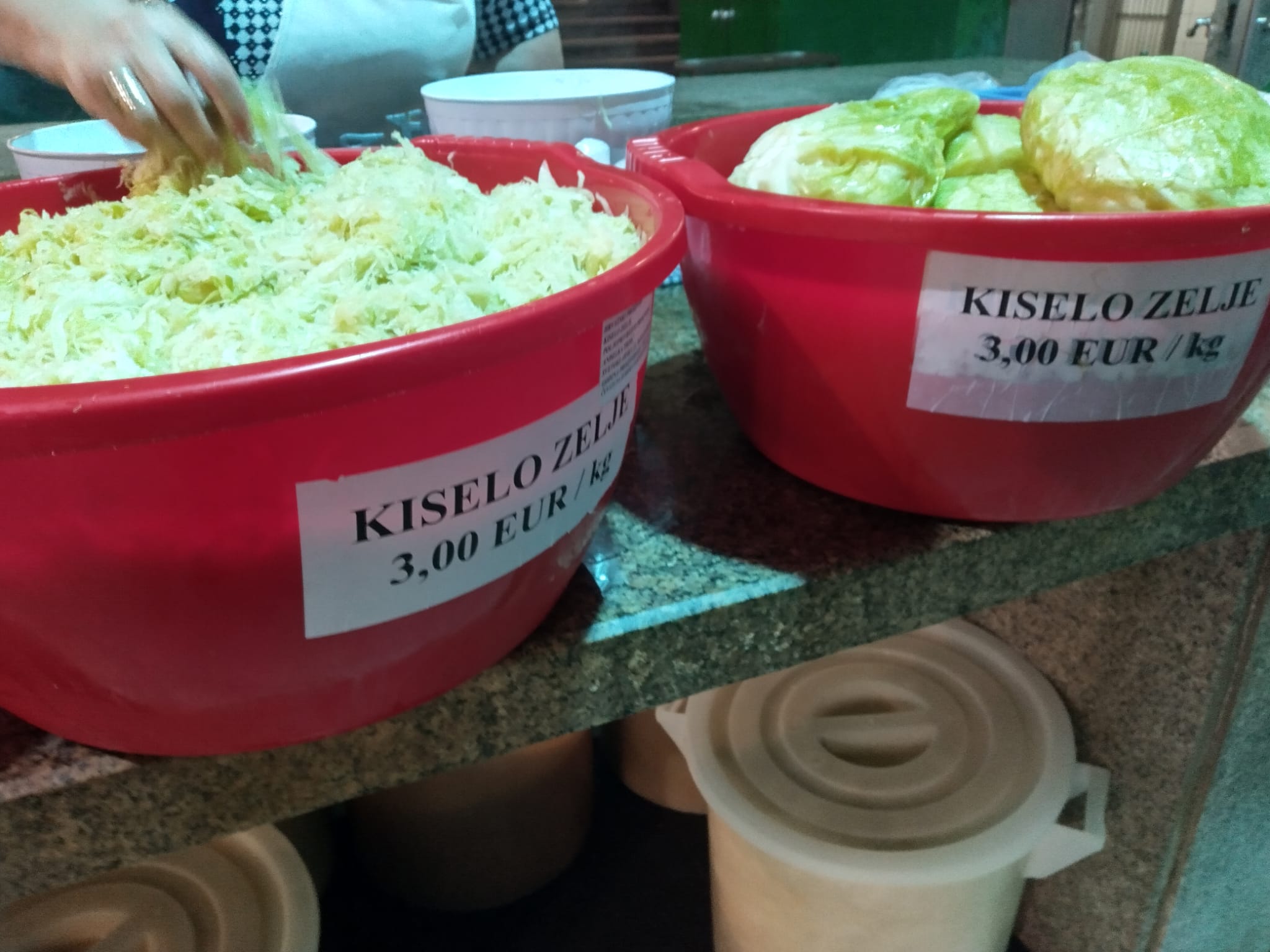 Na nekoliko štandova, cijena je ista, tri eura za kilu ukiseljenog zelja. Prodaje u dvije varijante: ribani ili cijela glavica.